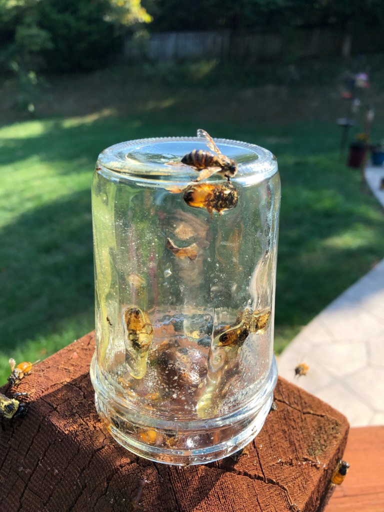 It was still fairly early when I set the jar out and within an hour or so I noticed a few bees. Now, if you have seen The Bee Movie, there is a part where Barry is literally swimming in honey…even going under to avoid listening to his mother lecture him. As you might have guessed the bees today were not as smooth in the honey as Barry in the movie!