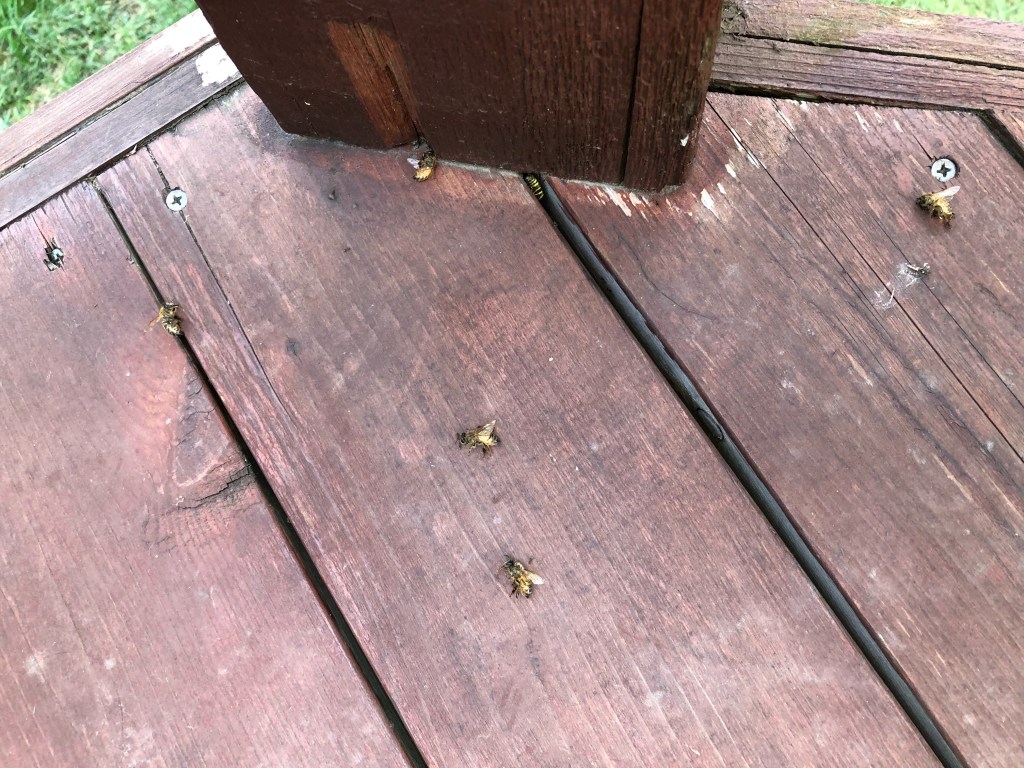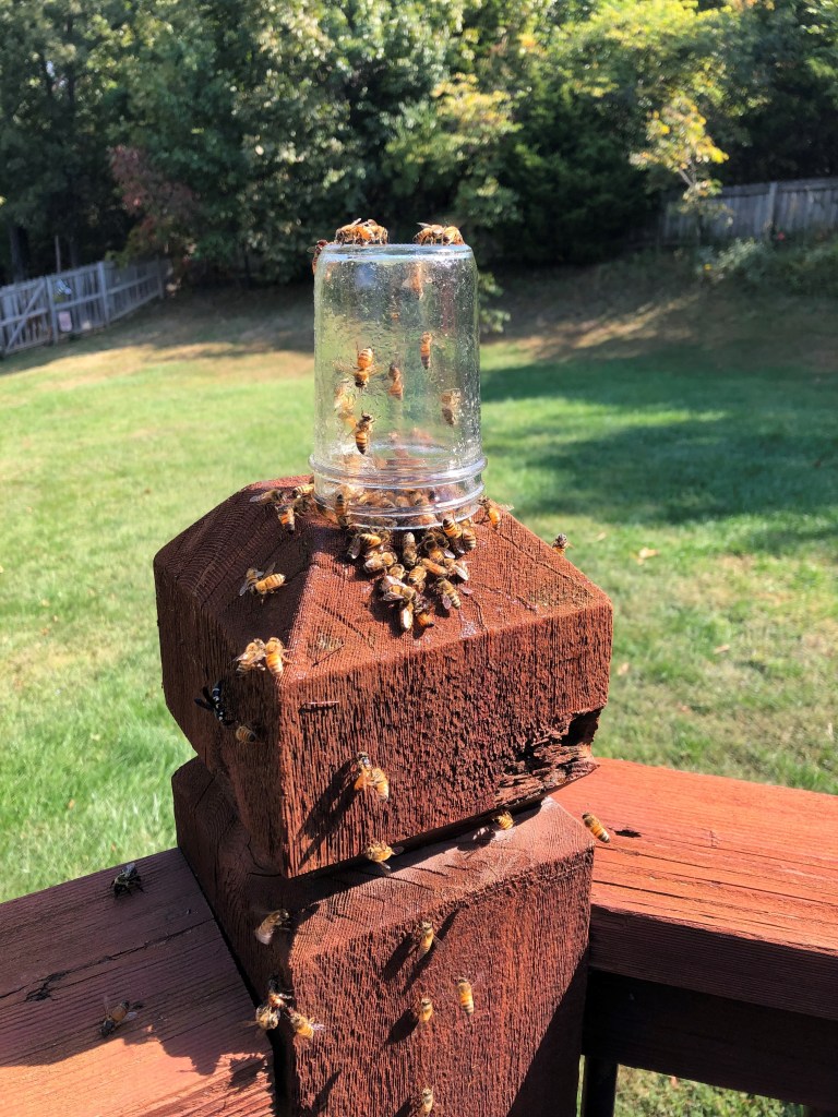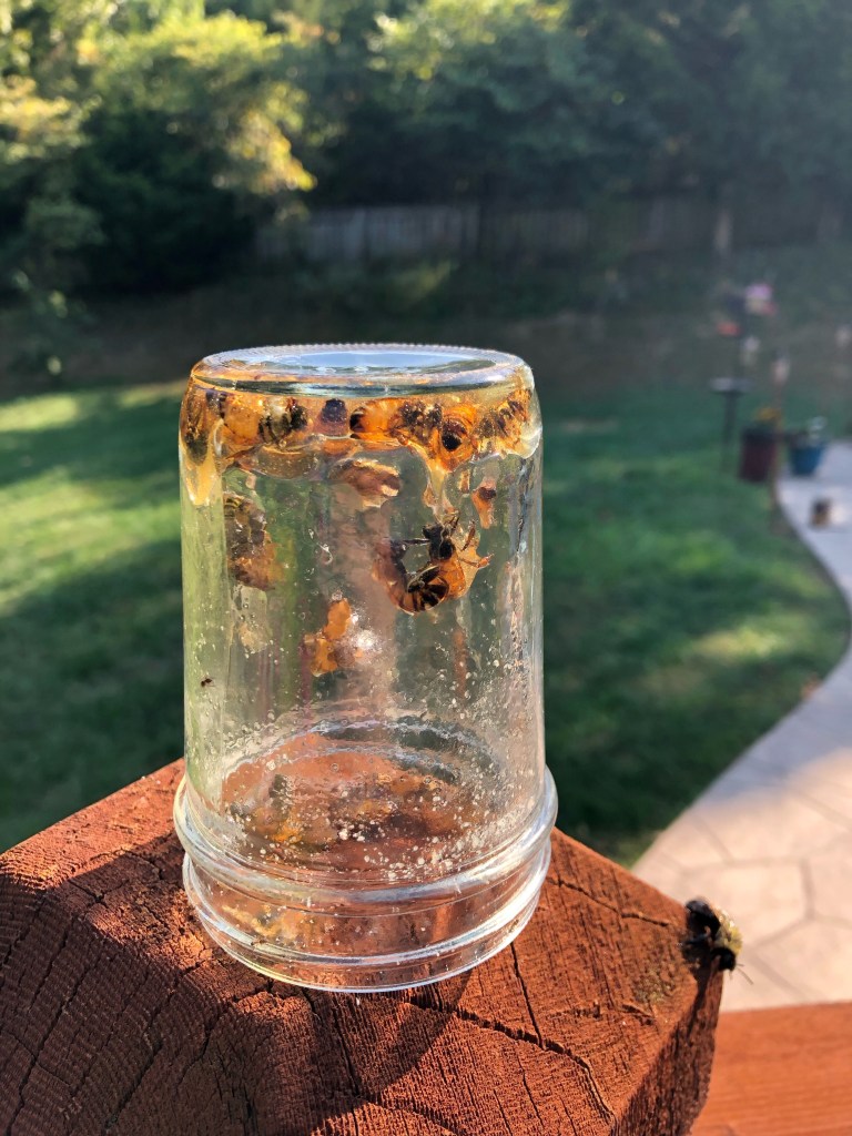 By early afternoon they had successfully cleaned up the jar. No sticky mess left at all. Sadly, there were a few dead bees below on the deck. I guess they really did drown in the honey…however, they aren’t laying there with honey in them, I guess the other bees cleaned it off them, too, even though they were dead?!?!?! 🤷🏻♀️