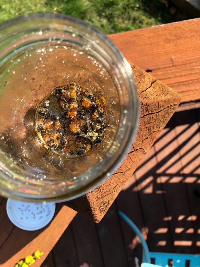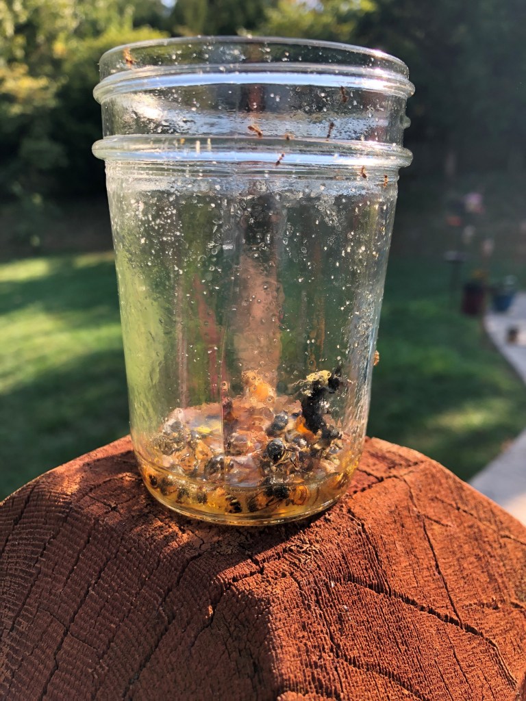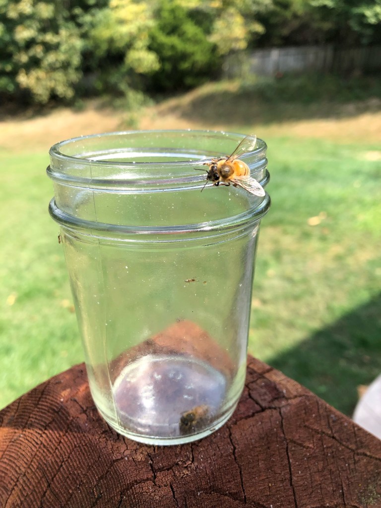 If you look closely you can see a few bees look to have drowned in the small amount of honey. Talk about feeling like a “bad beekeeper”. I’m not certain they were dead but they were drenched and a complete sticky mess. With that I decided to flip the jar over.
