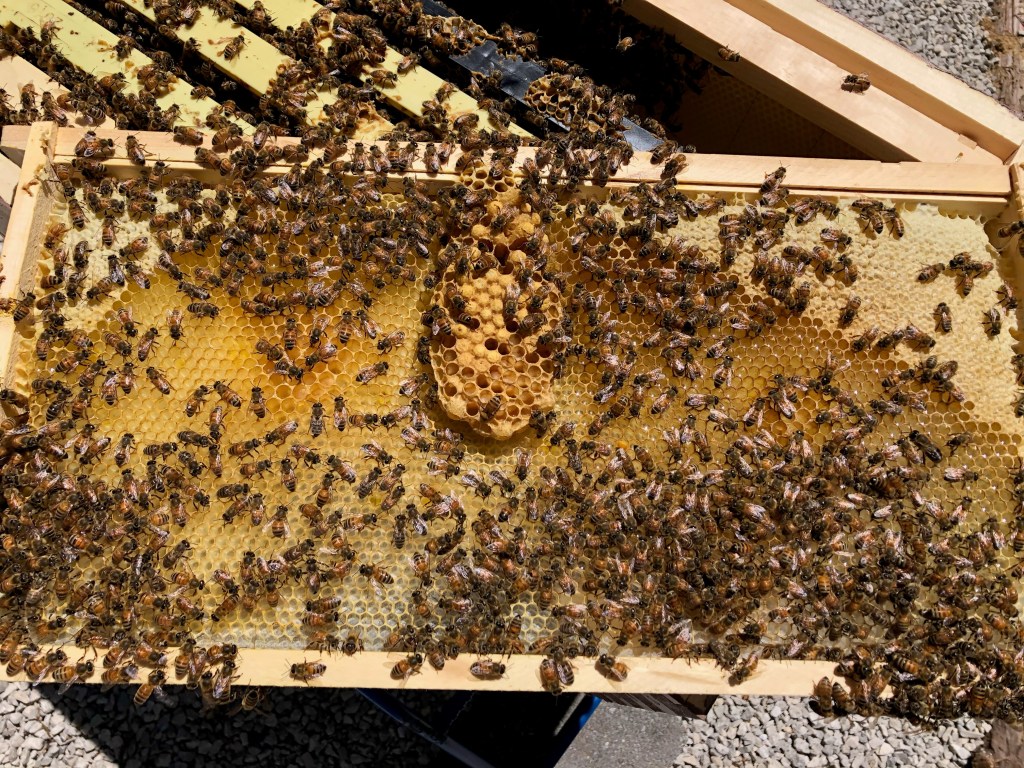 But for today, I’m so grateful that both hive inspections have gone smoothly. The bees are buzzing but they don’t come at you and they certainly don’t come at you in masses. Apparently this is not always the case. Sometime there really are “mean bees”. I guess it’s genetic. In those cases, because no one likes working with mean bees even if they are producing honey, a beekeeper might attempt to re-queen the colony. Sounds like a cool process but one I hope I never have to tackle due to aggressive bees! Thankful for the sweet little honey bees that are working hard from our backyard and hoping to avoid any/all mean bees of the world!