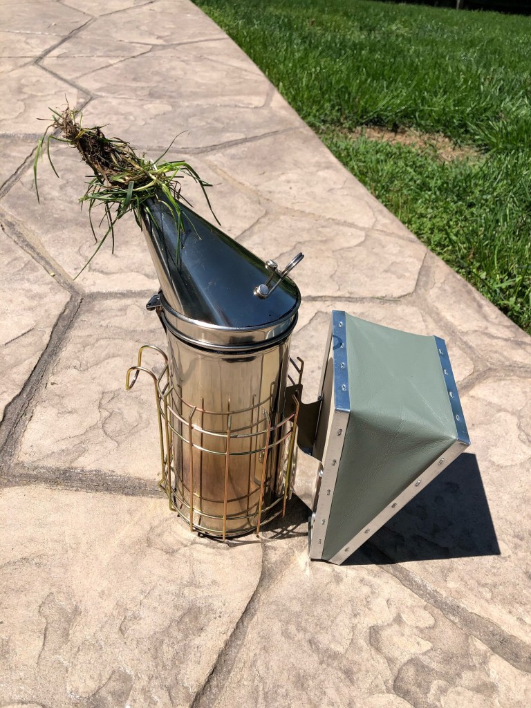 The little beekeeper did smoke the hives today…just a little. Wanted to give them a heads up that we were coming in. He did well with it and the bees responded accordingly. We did learn a good smoker tip today…when finished with the smoker, plug it with grass. It saves on the fuel and you don’t have to wait as long for it to burn out and cool!