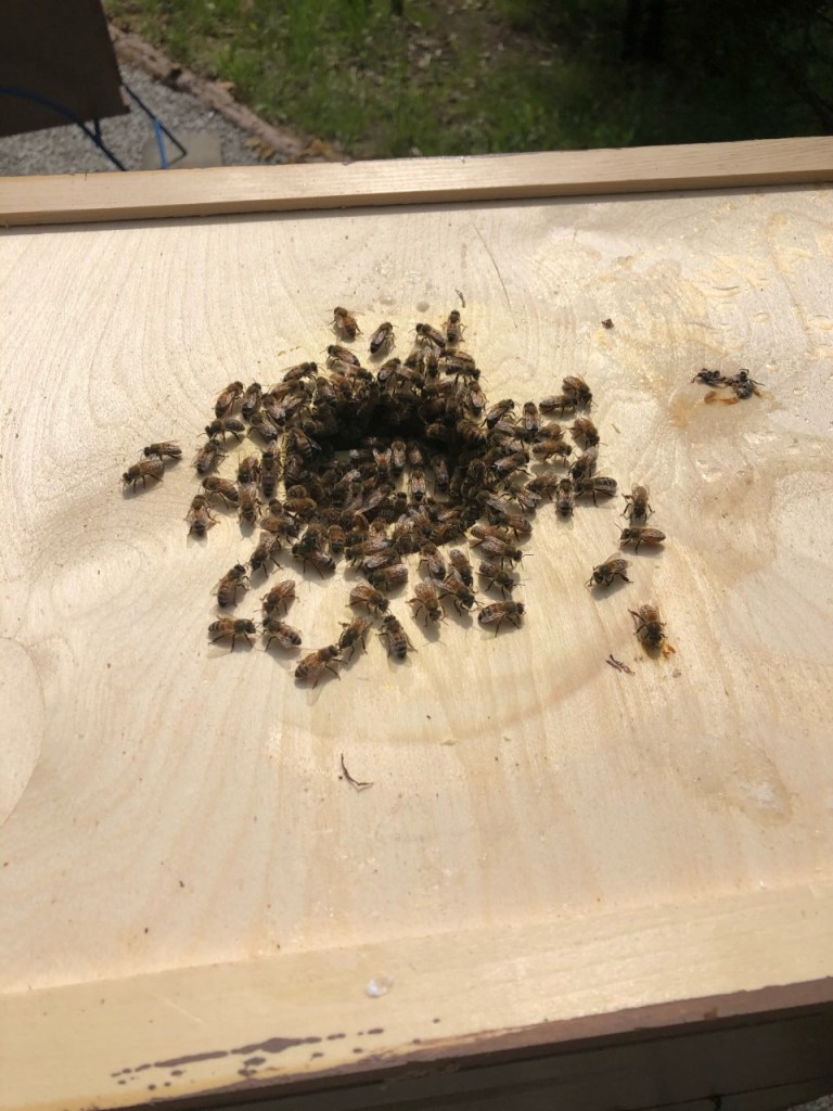 Sometimes mold will grow inside, I’ve been trying to wipe that away. Once the pails are refilled you have to place them back over the hole in the inner cover. This is sometimes hard to do without smashing bees. I’ve found a little patience and a small puff of smoke will drive the bees back down so the feeder can then be placed back over the hole.