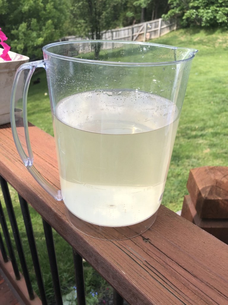 I am sad to admit that today when we went out to refill feeders the feeder in hive one was empty. I knew it would be low but hated to find it empty. First time that has happened. The bees in that hive seemed buzzier – maybe they were upset with the lack of sugar flow. Note taken. Hopefully we can keep that from happening again. Mixing sugar water in the 1:1 ratio is not rocket science but it’s sometimes tedious. I need to remember: eight pounds of sugar to one gallon of water…but I usually buy sugar in a ten pound bag so you can see where the measuring cup still haunts me. I think I just need a larger pitcher or better system in place. When I work out the kinks I’ll be sure to fill you in. For now, this is the largest pitcher I have and what I have been mixing in (it’s only partially full here because we were just topping off one of our feeders)