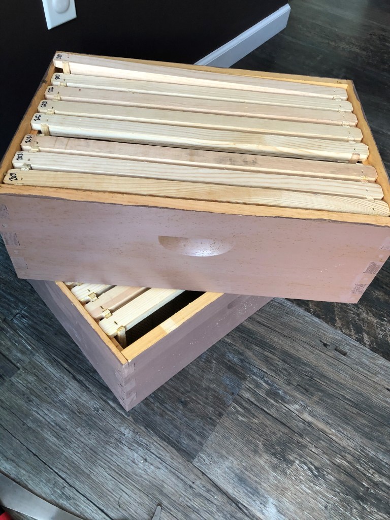 Planning between baseball games, birthday celebrations, vacations, and weather has been a challenge. We’ve successfully left home for vacation and returned with no known issues for our bees. They didn’t even need a sitter! Now the temperatures are rising, the rain is holding off and I’ve been told the nectar flow is on. We have removed the feeders and put the first super on both hives. Fingers crossed all goes well. These supers will hold the extra honey for harvesting. We’ll be looking to harvest the honey in the supers come late July.