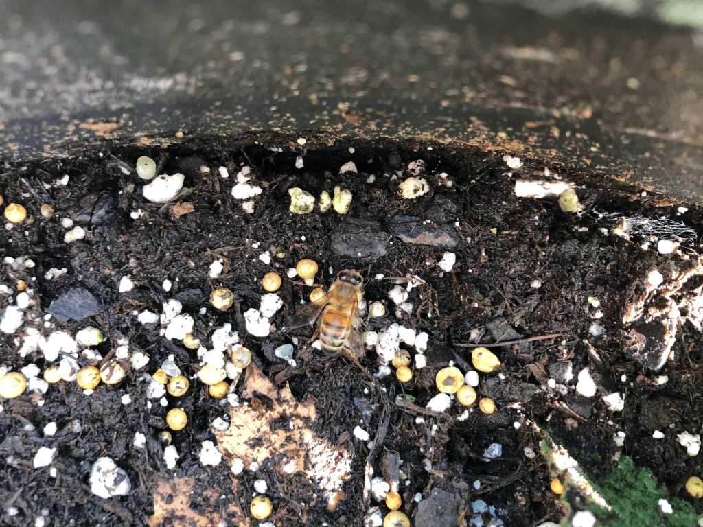 Incoming!!!! Just recently I’ve seen a few honey bees on our flowers. But we don’t see them often, I guess they have bigger and better places to work than the few flowers we have on our patio. When I do see a honey bee it’s often after I water and they seem just as interested in the water as they do any flower. See her here on the wet soil?