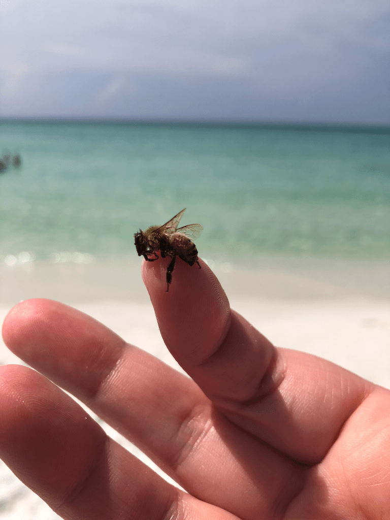 Of all the things you think you might see in the ocean, never did we think it would be a honey bee! Poor little bee. Before becoming beekeepers we may not have even noticed her but since we are beekeepers and our queen bee spotted her floating it warranted getting out of the water to take a pic.